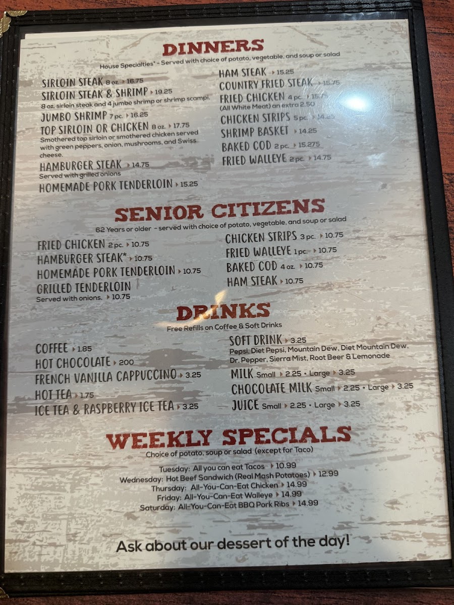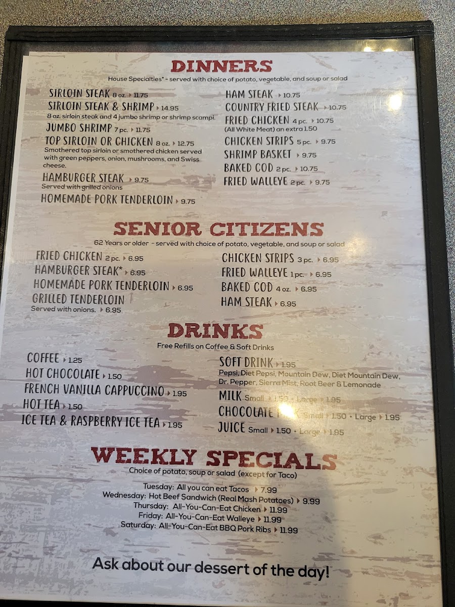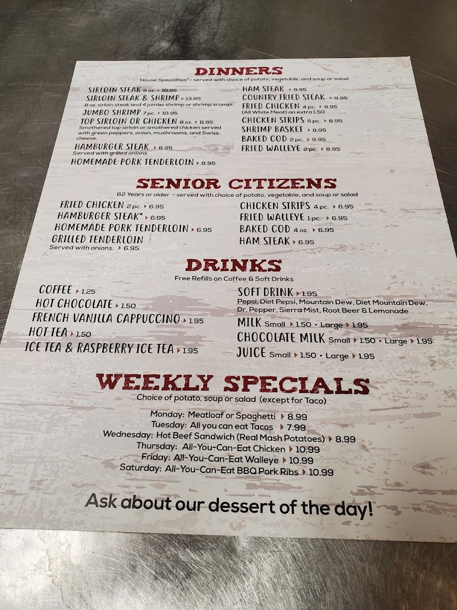 When it comes to dinners, there are plenty of comforting options to choose from. Indulge in the tender Ham Steak, crispy Country Fried Steak, or golden Fried Chicken. Chicken Strips and a Shrimp Basket are also on the menu, ensuring something for every taste.