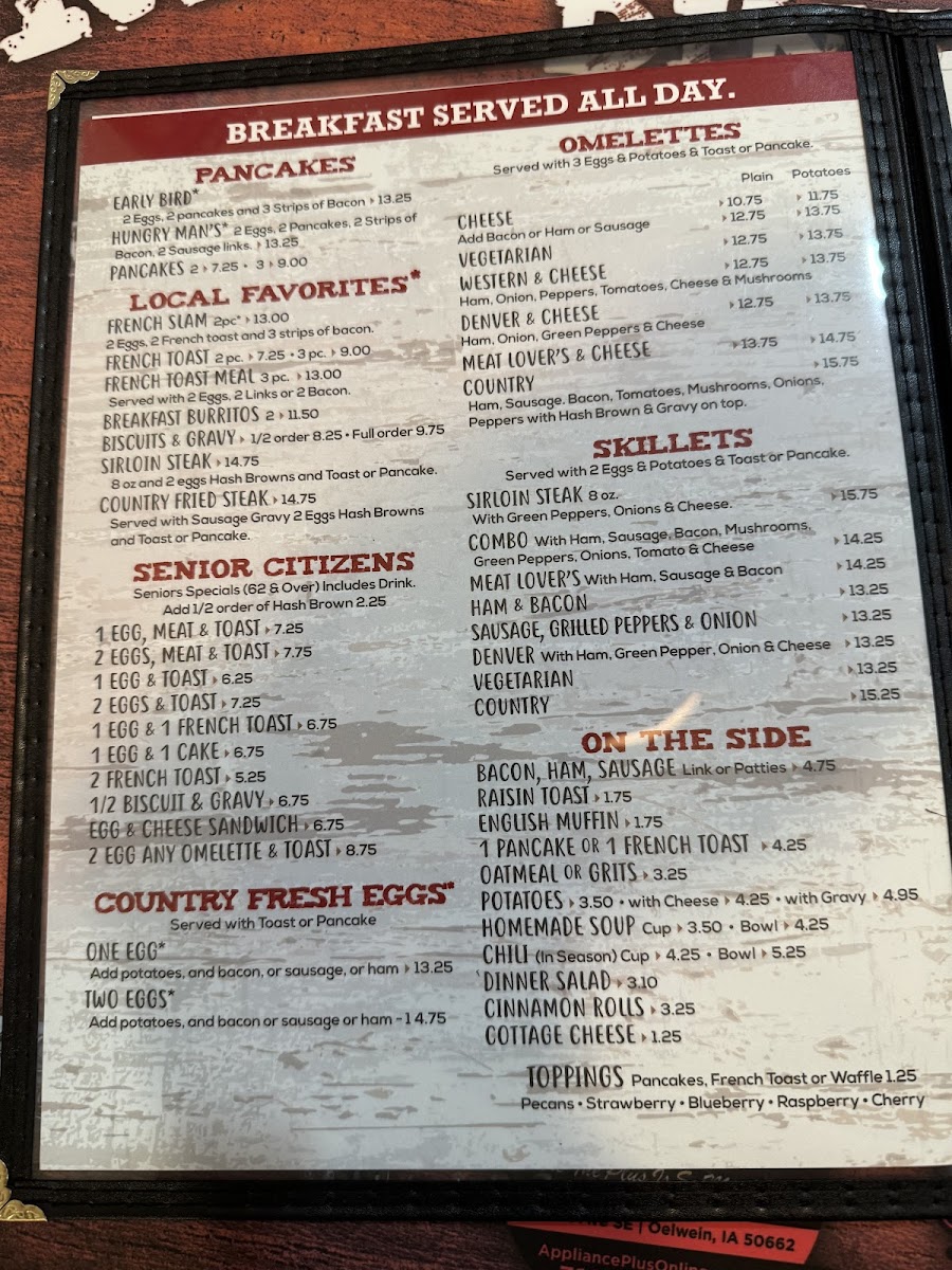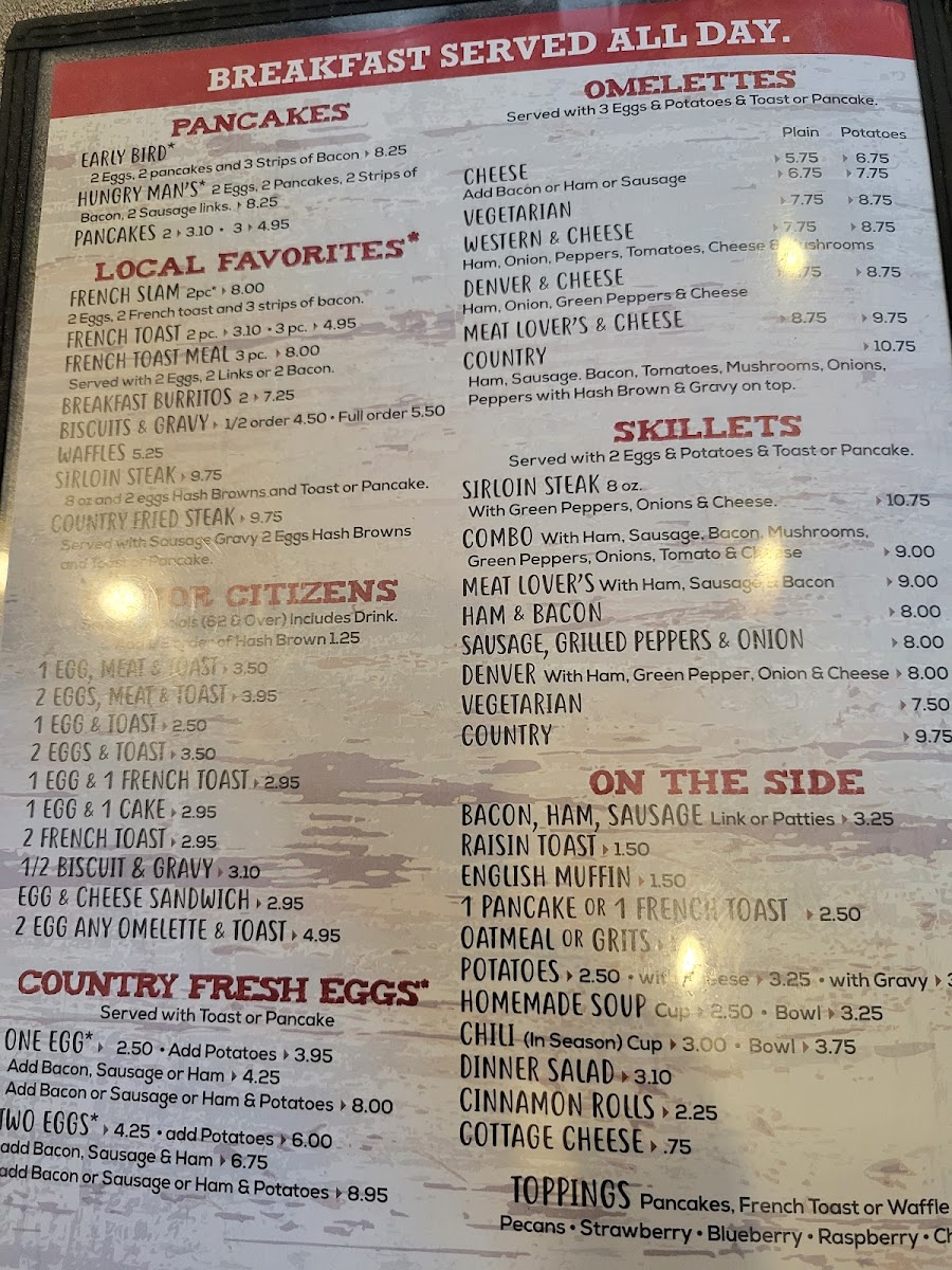 On the side, enjoy classics like crispy Bacon, Sausage, and Ham, or try a comforting serving of Oatmeal, Grits, or even Raisin Toast. For a lighter option, Homemade Soup is always a comforting choice.