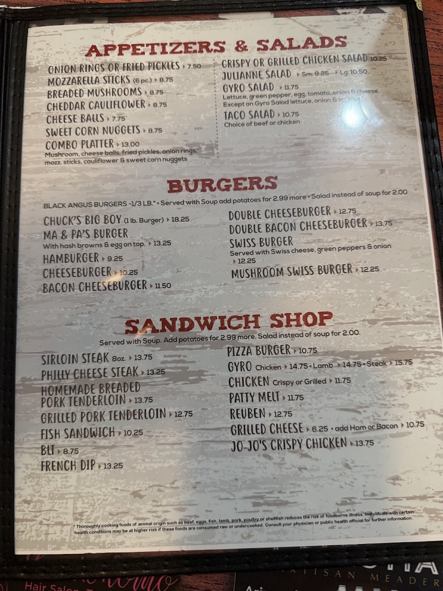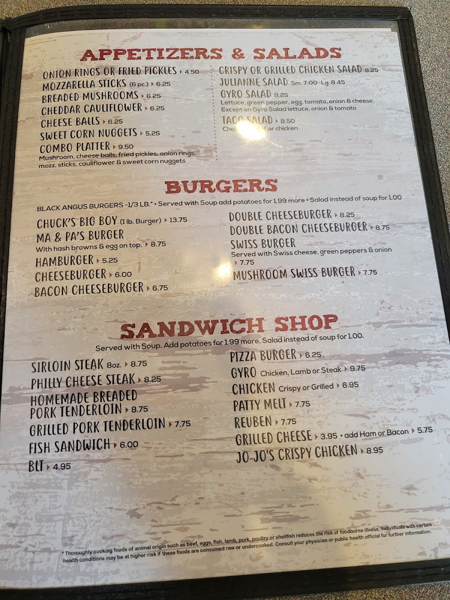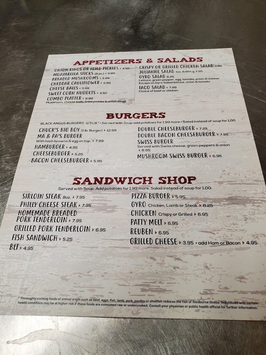 The burger section offers several mouthwatering options. For something classic, try Ma & Pa's Burger or go bigger with Chuck's Big Boy, an indulgent option for burger lovers. If you're craving a more familiar choice, Cheeseburgers, Bacon Cheeseburgers, and Hamburgers are also available, each offering its own delicious twist on the classic.